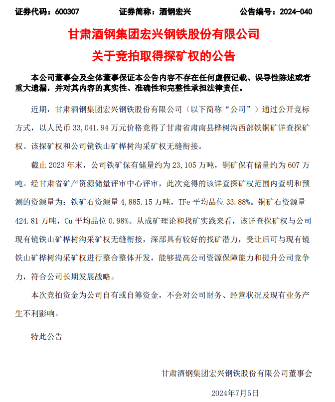 7月5日,據(jù)酒鋼宏興公告稱,公司近期通過公開競標(biāo)方式,以人民幣 33,041.94 萬元價(jià)格競得了甘肅省肅南縣樺樹溝西部鐵銅礦詳查探礦權(quán)。