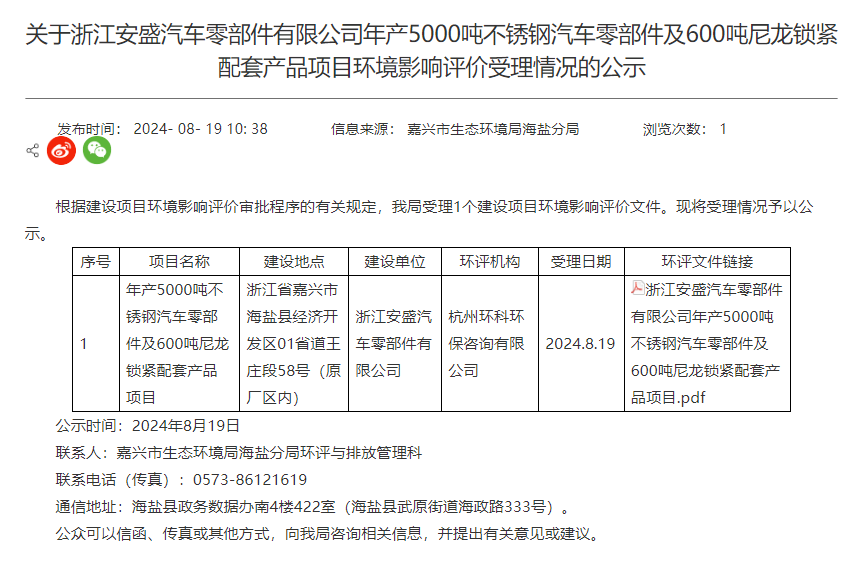 8月19日,嘉興市生態(tài)環(huán)境局海鹽分局受理浙江安盛汽車零部件有限公司年產5000噸不銹鋼汽車零部件及600噸尼龍鎖緊配套產品項目環(huán)境影響評價報告表并對外進行公示。